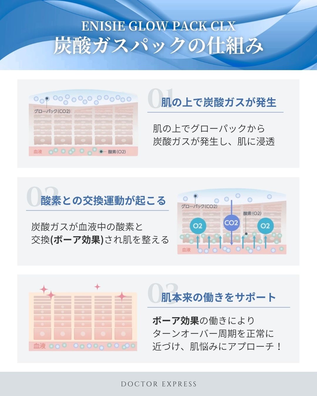 エニシーグローパックCLXにはどのような効果があるのか、また炭酸ガスパックの仕組みをご紹介します。