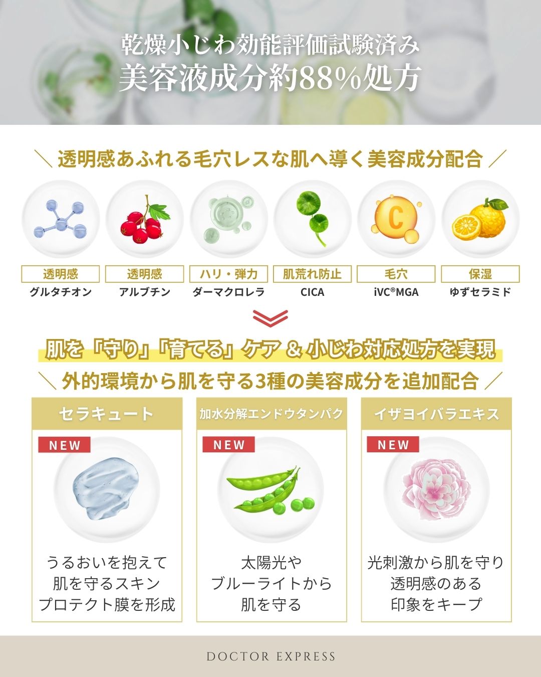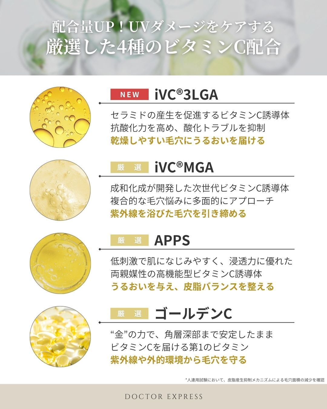 「たるみ毛穴」への有用性が確認され注目を集めたAPPS*¹をはじめ、毛穴の目立ちをケアするiVC®︎MGA*²、 角層への浸透を助けるゴールデンC*³、さらに乾燥した角層へ浸透し、うるおいで毛穴をふっくらと整えるiVC®︎3LGA*⁴ を厳選配合。