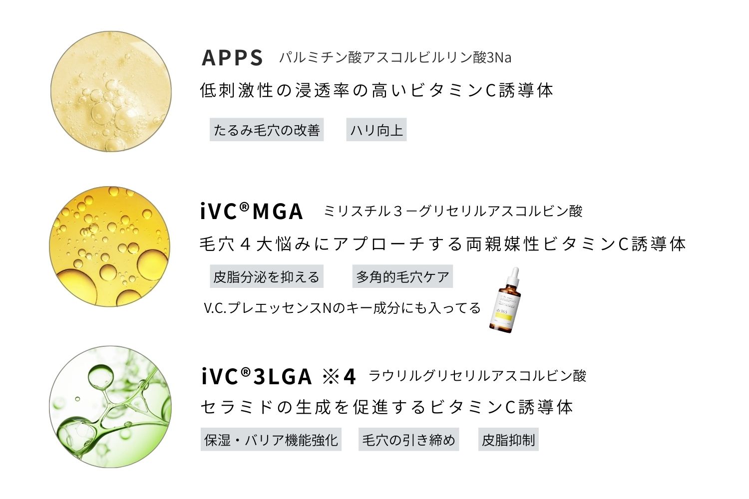 毛穴にハリ感を与えることが最新の研究で明らかになった「APPS*¹」や、浸透性に優れた「iVC®︎MGA*²」、さらに乾燥した角層に浸透し、うるおいを与え、毛穴を目立たなくする「iVC®︎3LGA*³ 」を組み合わせて配合。