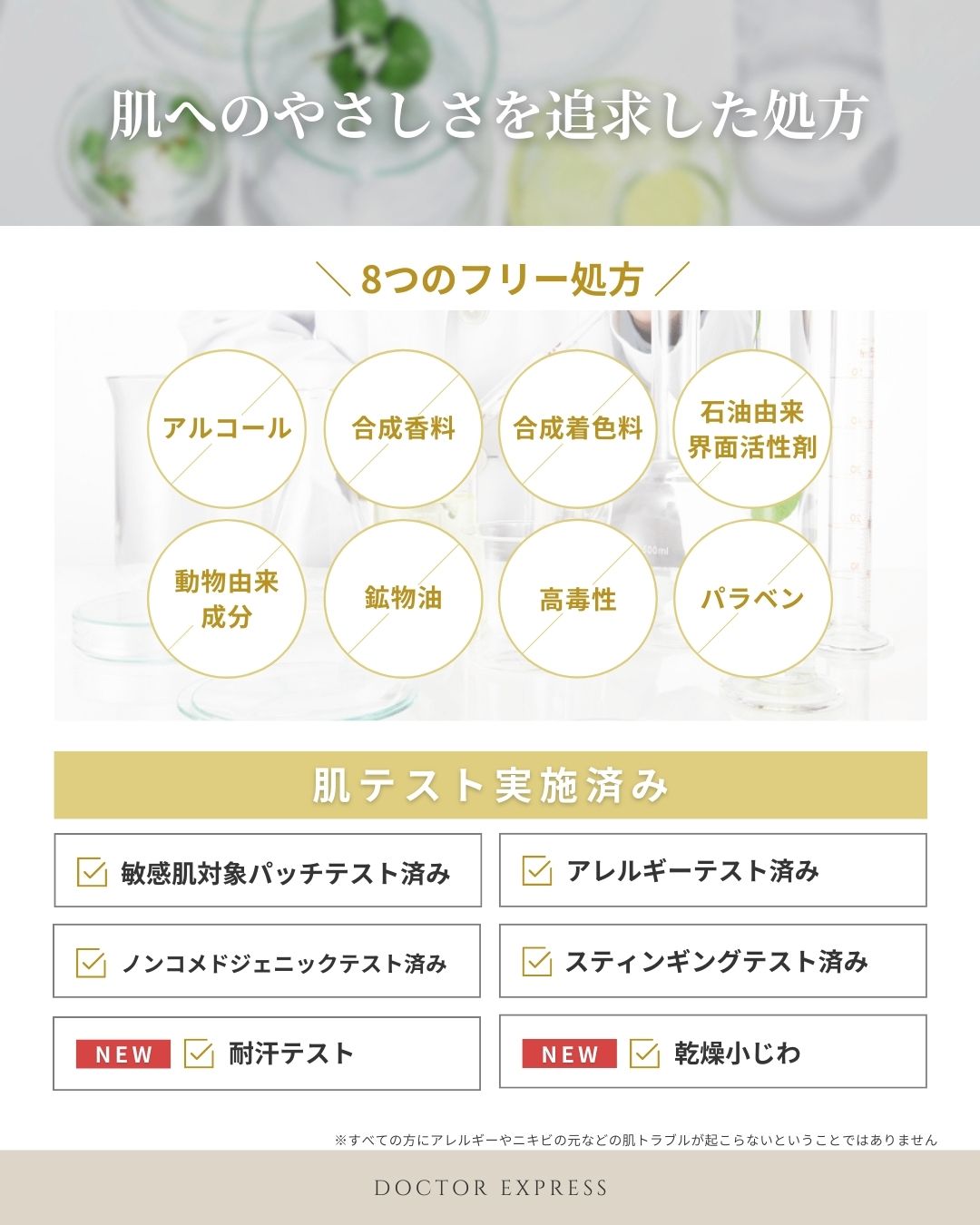 フリー処方&さまざまな肌テストで敏感肌の方も毎日安心して使える処方にこだわっています。